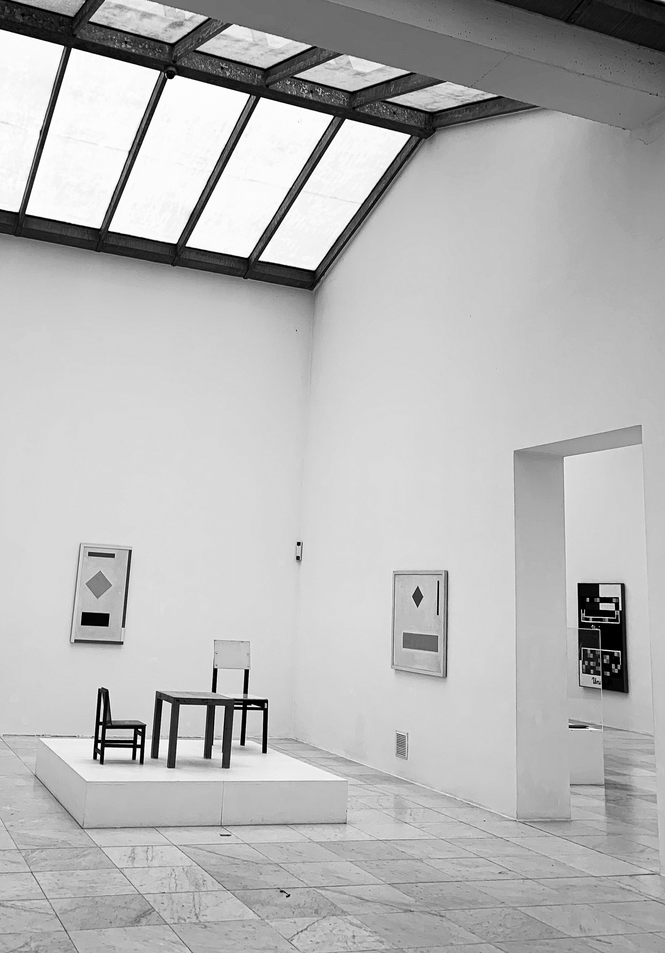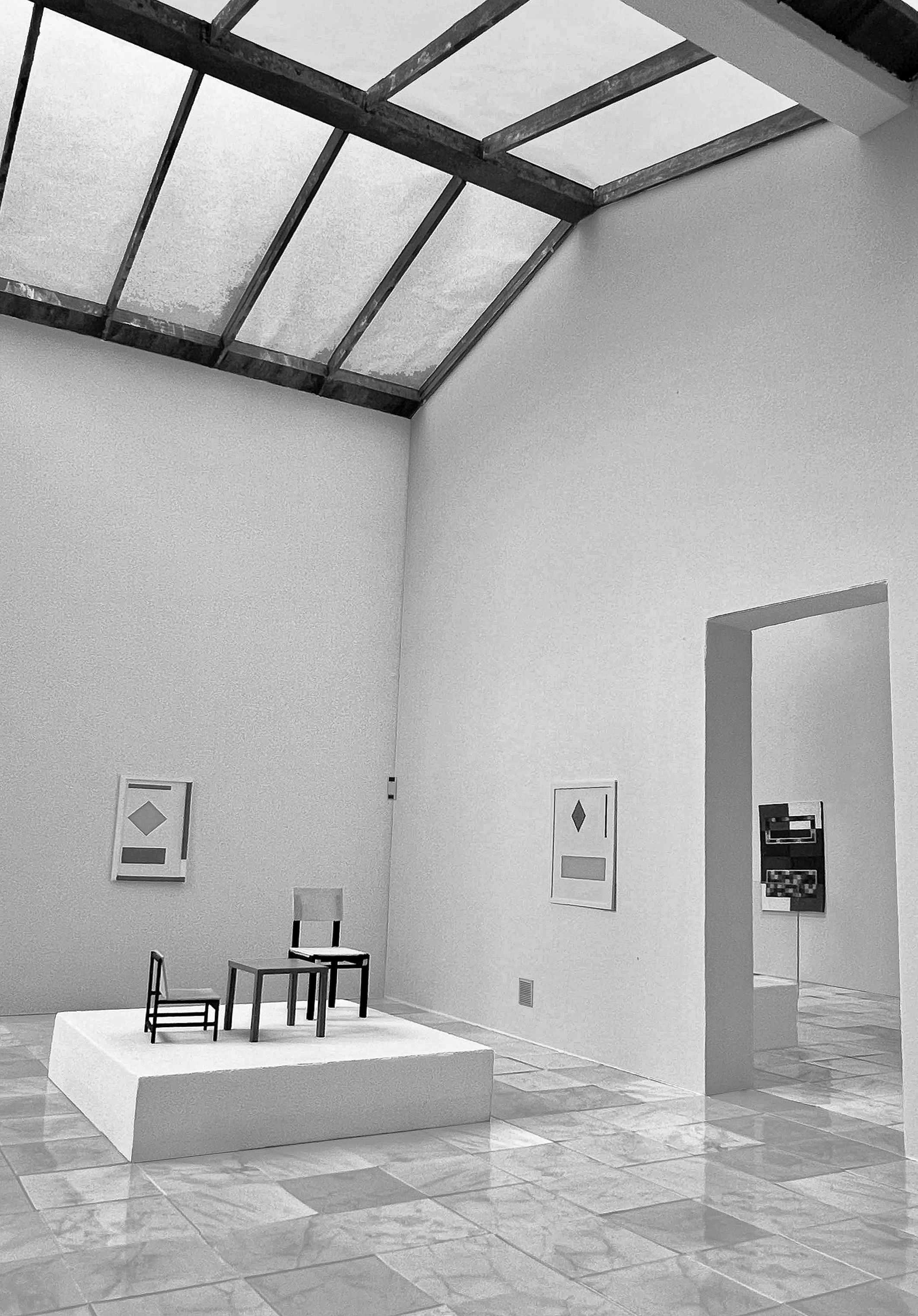 das modell ‚museum insel hombroich‘ orientiert sich an einem maßstab von etwa 1:20 – „etwa“, weil fotorealistische maßstäbe immer ein spiel der annäherung sind. durch die perspektivische verzerrung der kamera entsteht kein absoluter maßstab, sondern ein interpretierter. alle proportionen wurden daher sorgsam aus dem original heraus geschätzt und räumlich neu übersetzt. die möbel sind eigens 3d-gedruckt, der modellkörper aus mdf gefertigt, der boden mit fotopapier beklebt. die dachkonstruktion ist aus holzstäben gearbeitet. so wird das modell zum mittel, die fotografie zum ziel: sie zeigt den raum so, wie er im maßstab erst sichtbar wird.