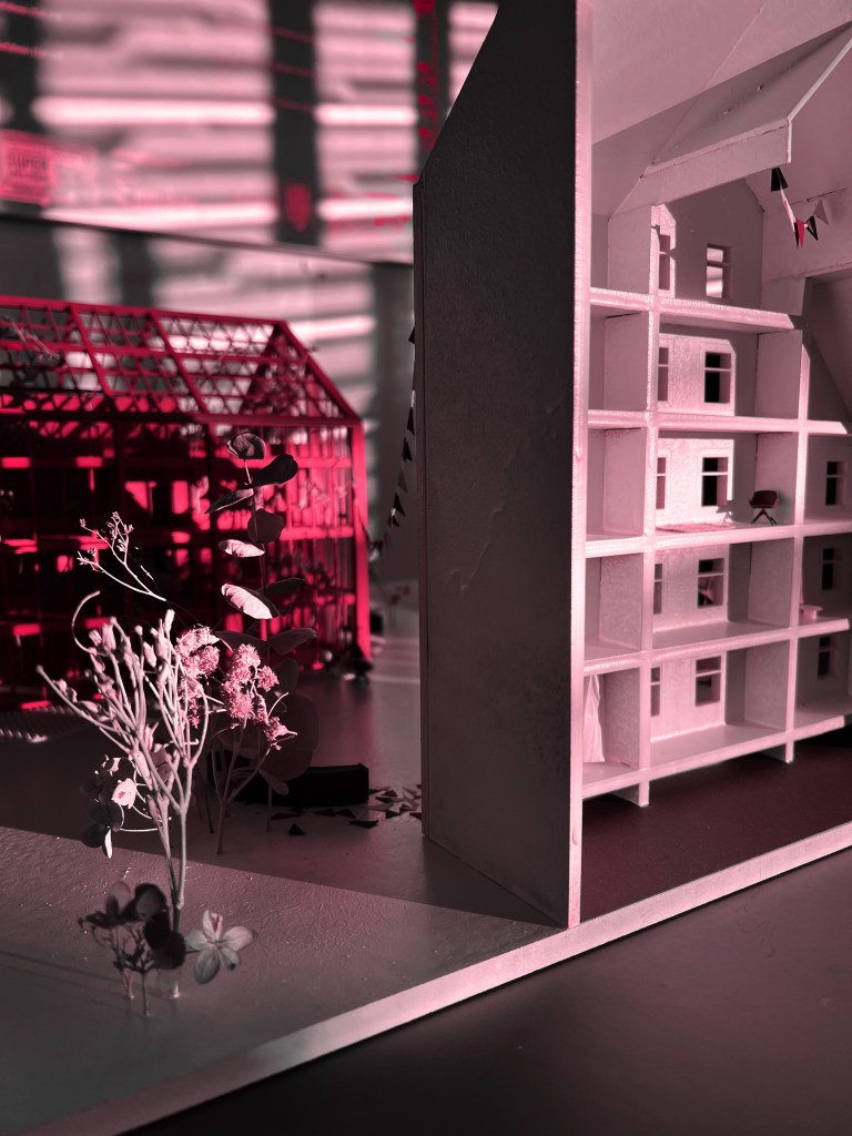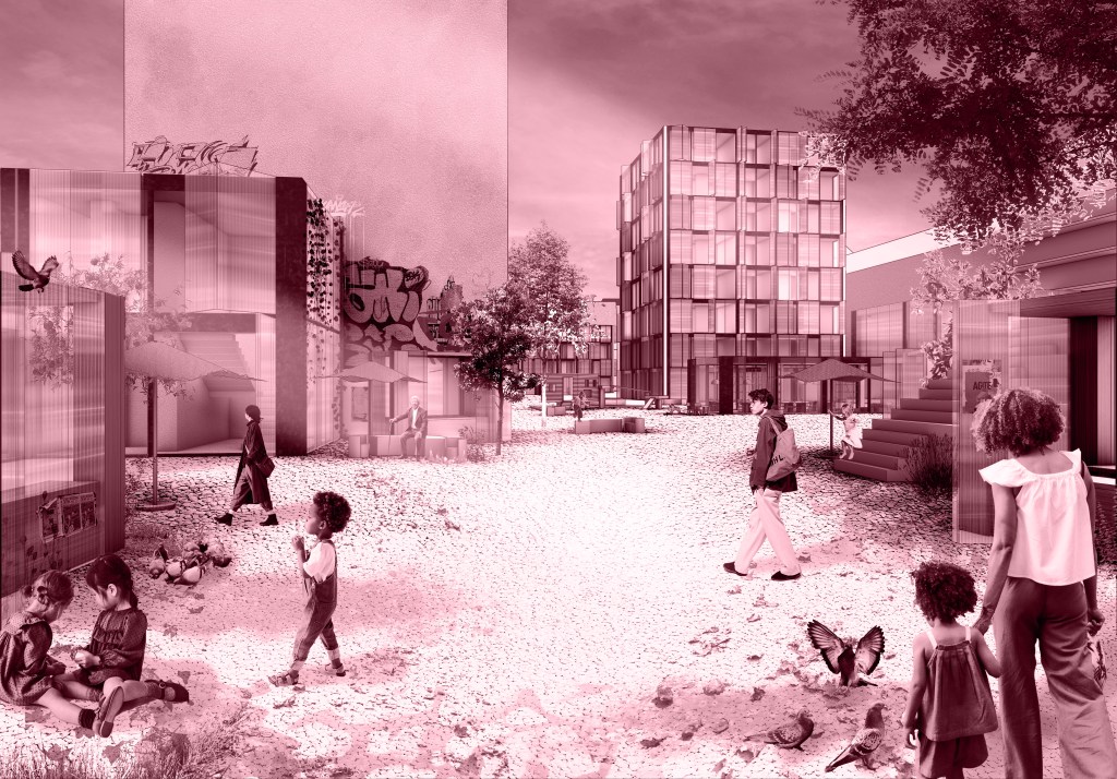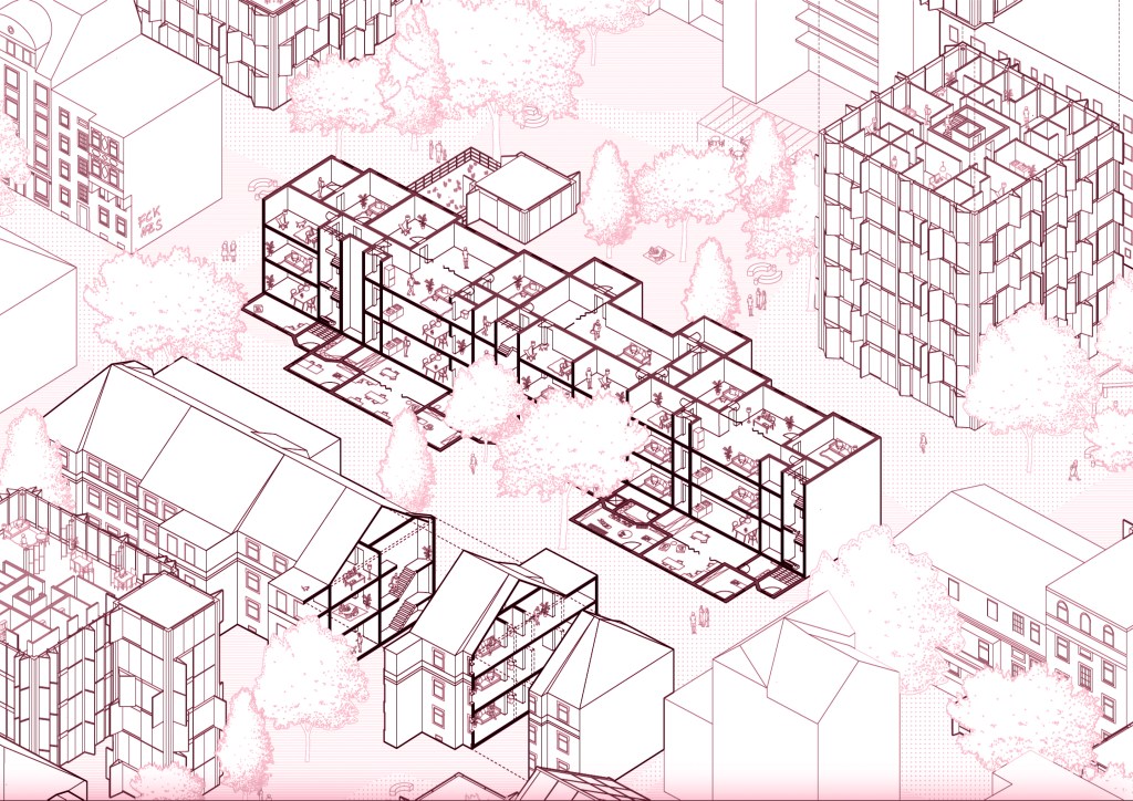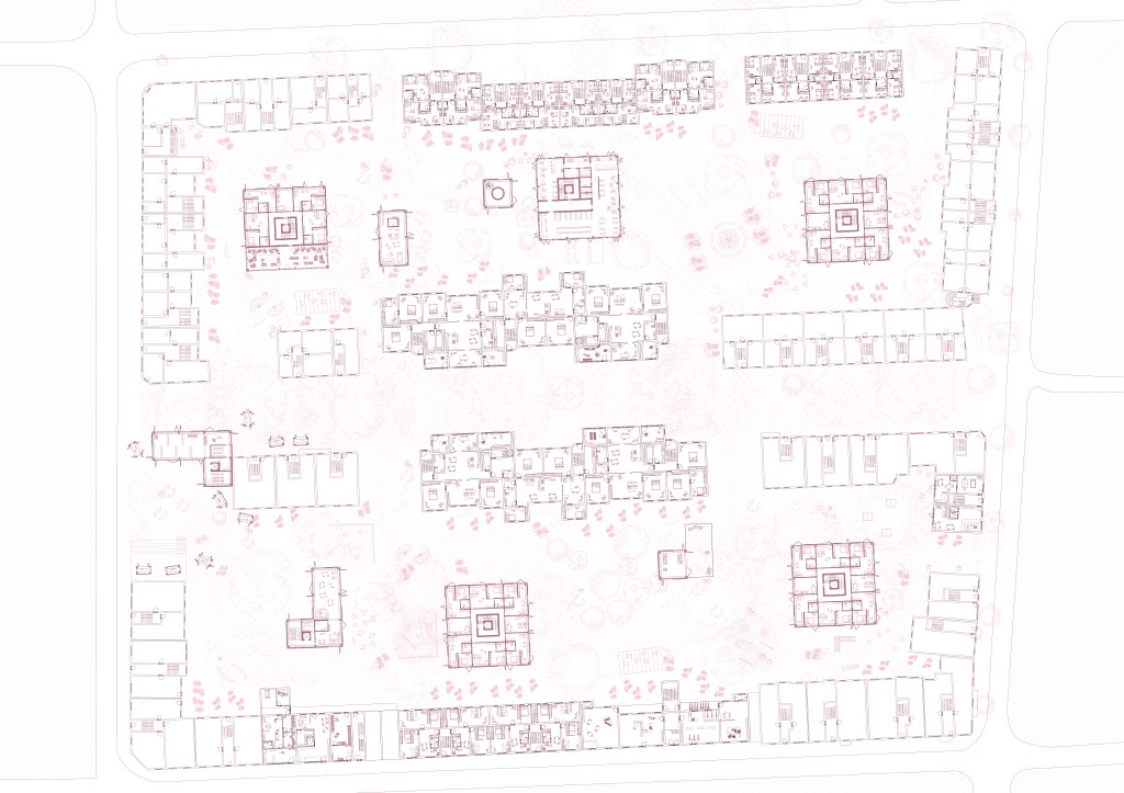 der entwurf arbeitet auf drei ebenen: geschoss, block, quartier. kleine architektonische eingriffe – etwa im bestand – wirken ebenso transformativ wie großmaßstäbliche ergänzungen im stadtraum. so entsteht ein mehrschichtiges system, das auf alltägliche bedürfnisse reagiert und gleichzeitig das quartier langfristig stärkt.
