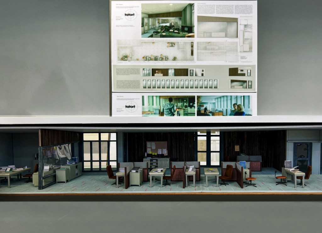über genaues hinsehen und analysieren von raum in bewegtem bild auf dessen konstruktive logik schließen am beispiel ‚tatort bremen‘. das ermittlerinnenbüro ist als länglicher, offener arbeitsraum konzipiert, der mehrere funktionszonen vereint: arbeitsplätze, teeküche, kopierraum und ein separates büro, das über eine glastrennwand angebunden ist. die raumstruktur übersetzt die atmosphäre des filmischen vorbilds in eine klare, konstruktiv nachvollziehbare architektur mit hoher nutzungsflexibilität.