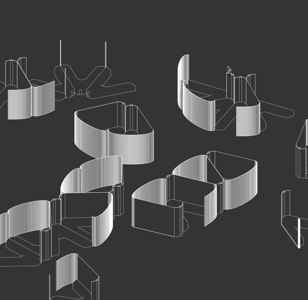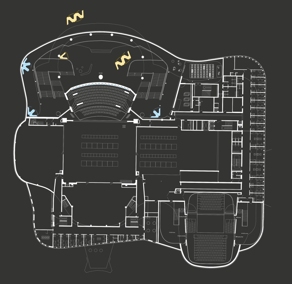 die im foyer und auf den ebenen des saals positionierten pavillons sind als offene, modulare bausteine gedacht. sie bilden rückzugsräume ohne exklusivität, können einzeln genutzt oder zu größeren einheiten verbunden werden und öffnen sich bei nichtnutzung vollständig zum foyer. ihre reduzierte formensprache, sanfte radien und textile einbettung erzeugen einen visuellen gegenpol zur dramatik des theaterbetriebs. durch liveübertragung der aufführung fungieren sie als erweiterungsraum des theaters – ein leiser, aber integraler bestandteil des gesamterlebnisses.